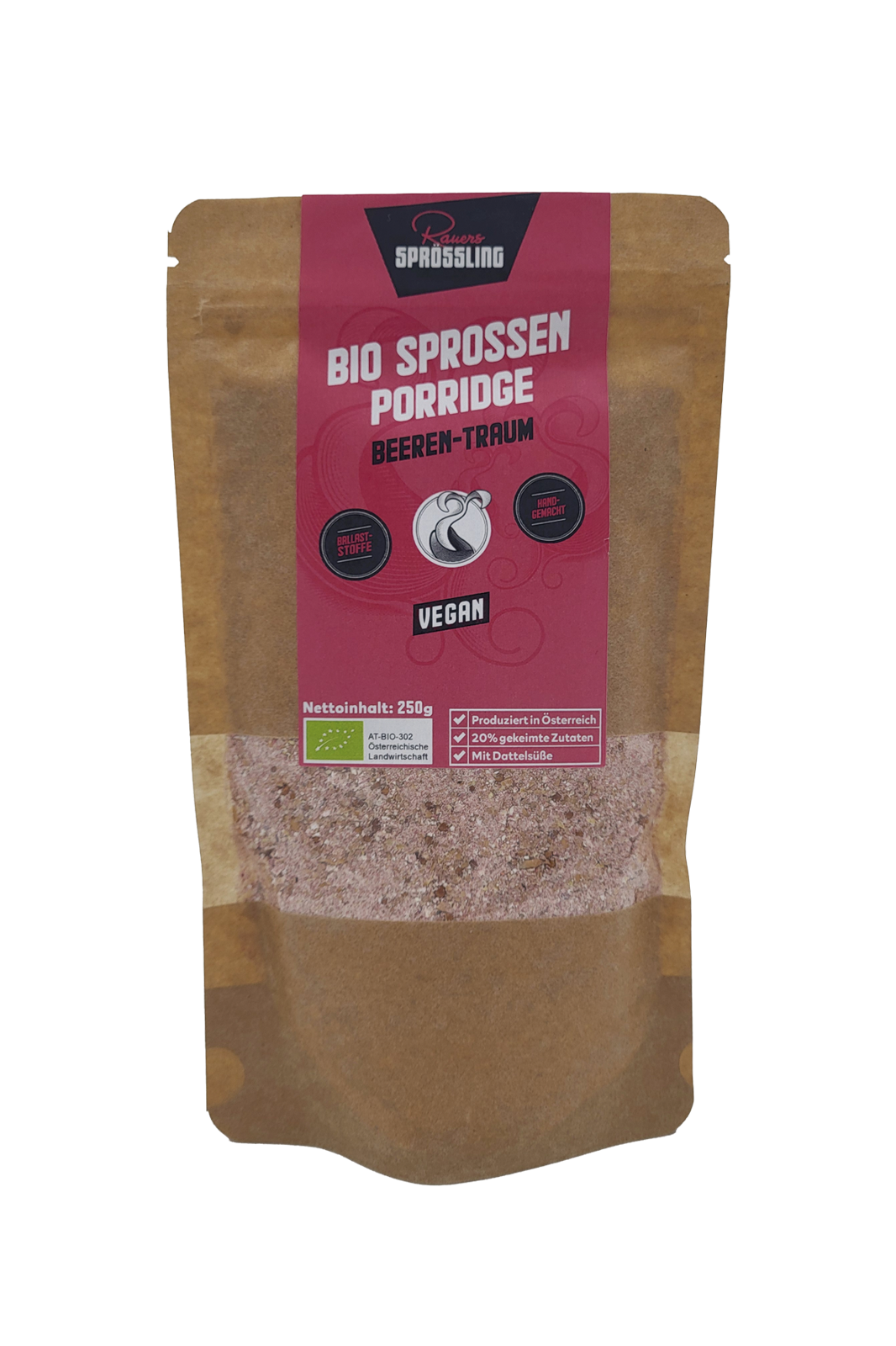 Fruchtiger Start in den Tag: Unser Bio Sprossen-Porridge Beeren-Traum kombiniert feine Urgetreideflocken, 21 % gekeimte Zutaten und natürlich süße Fruchtkomponenten – ganz ohne zugesetzten Zucker.